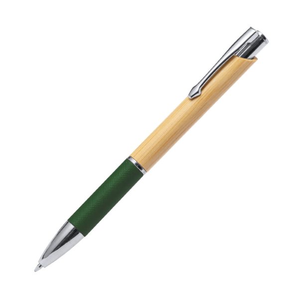 Bolígrafo con cuerpo en bambú y papel reciclado. Caña fabricada en suave bambú con empuñadura hecha en cartón reciclado con textura y en variados colores. Clip metálico y accesorios en cromado. De mecanismo pulsador, de cartucho jumbo y con tinta azul. Elaborado con elementos vegetales para así fomentar la utilización de materias primas naturales y reducir las emisiones contaminantes. Carga Jumbo