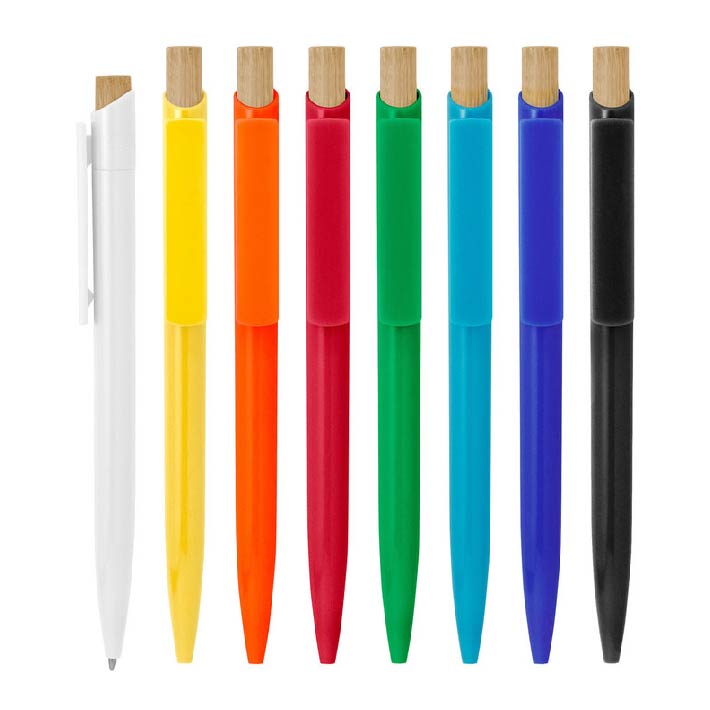 Bolígrafo retráctil. Cuerpo de diferentes colores. Pulsador de bambú. Clip del mismo color del cuerpo.
