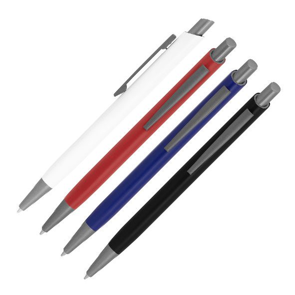 Bolígrafo retráctil. Cuerpo revestido en laca de diferentes colores. Acabado mate. Pulsador, clip y puntera de color gris gun metal.