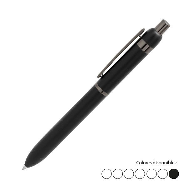 Cuerpo de aluminio. Bolígrafo retráctil. Clip, botón y anillos metálicos color plata. Destape electroplateado en ambas partes. Presentación en estuche con cierre magnético.
