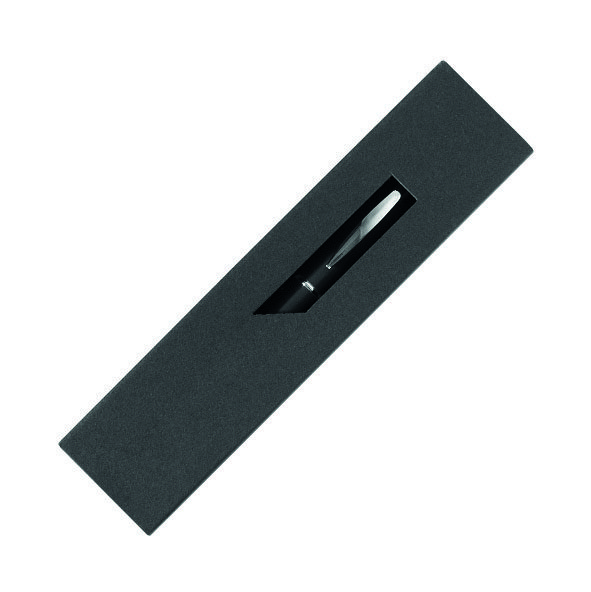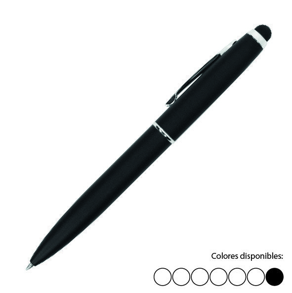 Cuerpo color negro engomado. Puntera touch y apertura giratoria. Cuenta con detalles color plata. Decapa plata. Presentación en caja de regalo.