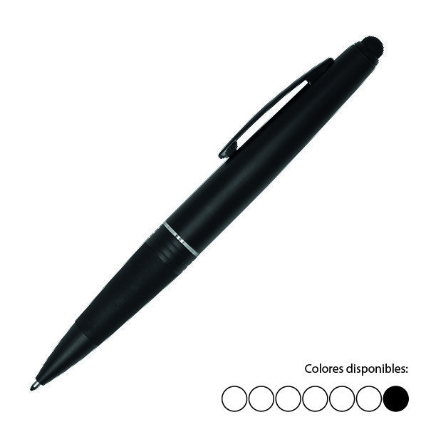 Bolígrafo touch. Cuerpo color negro mate, electroplateado en parte superior. Clip metálico negro brillante, detalle en color plata. Apertura giratoria.