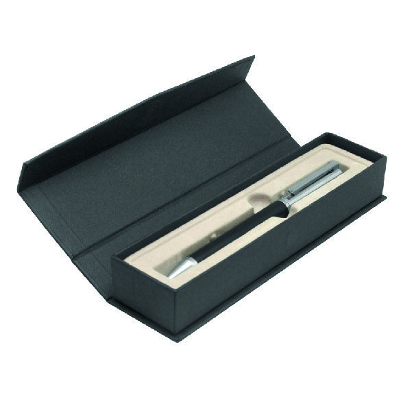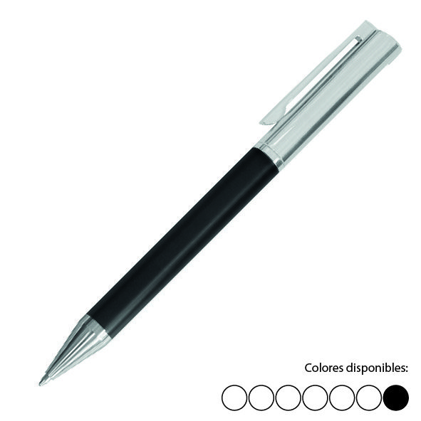 Bolígrafo con apertura giratoria. Destape acero en la parte superior e inferior. Cuerpo color negro. Clip, tambor superior y puntera color plata. Presentación en estuche con cierre magnético.