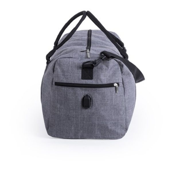 Bolso multiusos en resistente de acabado denim. Con conexión USB -cable y power bank non incluidos-, compartimento independiente de cierre de cremallera para el calzado y bolsillo lateral de cremallera. Compartimento principal con cierre de cremallera de doble tirador y asas de transporte reforzadas con acolchado. Refuerzo de nylon alrededor del cuerpo y cinta bandolera ajustable de doble cierre de mosquetón. Conexión USB. Compartimento Portazapatos.