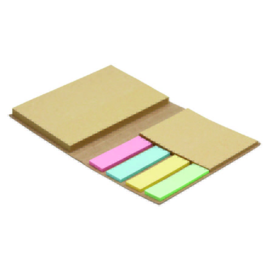 Bloc de notas autoadhesivas. Cubierta de 300 grms. Incluye: 50 hojas kraft de 9,5 x 6 cm., 25 hojas kraft de 5 x 6 cm y 5 blocs de 25 hojas en colores verde, amarillo, celeste y rosa de 4,5 x 1 cm.