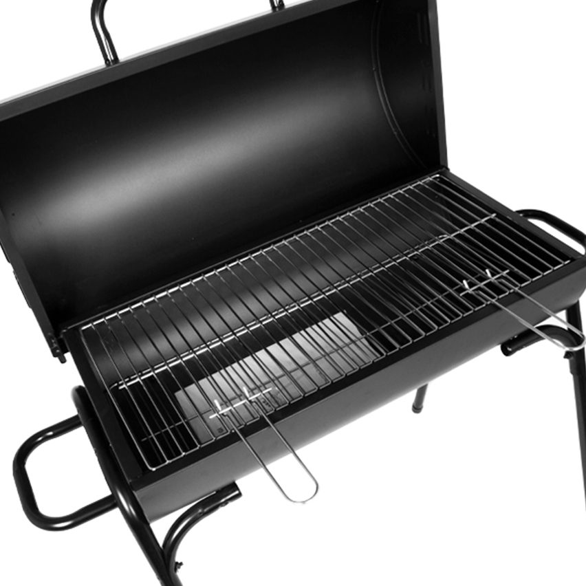 Parrilla a Carbón de Acero negro, modelo «Tambor». Altura para cocinar: 72cm. Rejilla cromada para cocinar: 60 x 29cm x 4mm. Rejilla cromada para carbón: 60 x 27cm x 3mm. Tapa: 67.5 x 35 x 18cm. Bowl para fuego: 63.5 x 33 x 16.5cm. Fácil de armar y transportar. Incluye Manual instructivo de armado en español.