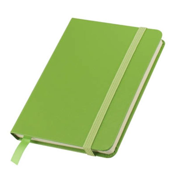 Libreta tamaño A6, Interior 80 hojas lineadas amarillas de 80gsm. Incluye banda elástica y huincha separador de hojas al tono.
