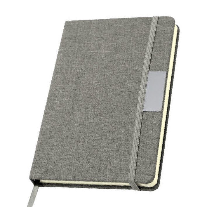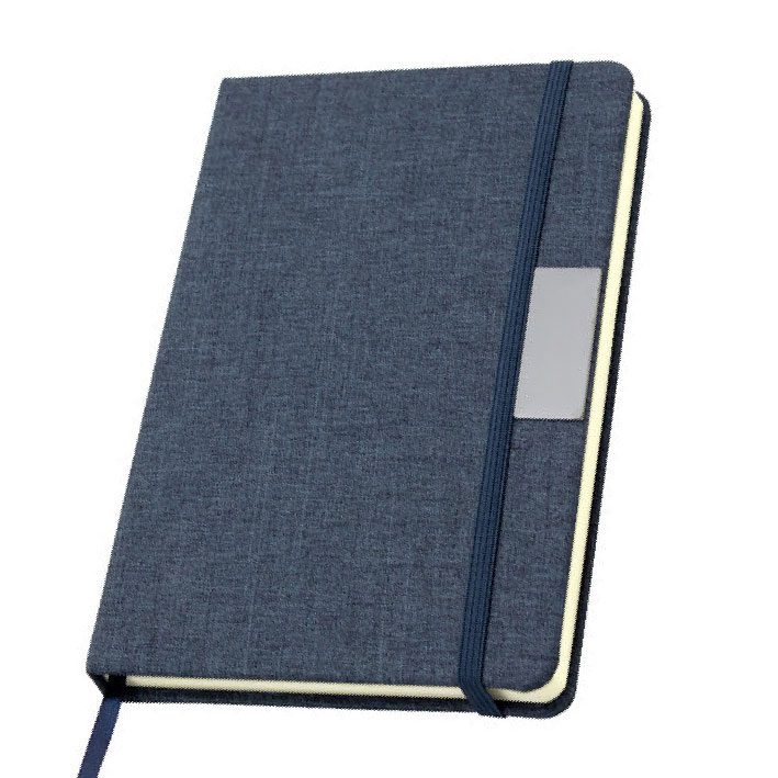 Libreta con placa metálica. Tapa de cartón de 300g recubierta en RPET 310. Placa metálica de 5 x 2 cm. Interior de 80 hojas rayadas en papel obra de 70g. Encuadernación cosida. Cierre con banda elástica del mismo color de la tapa.