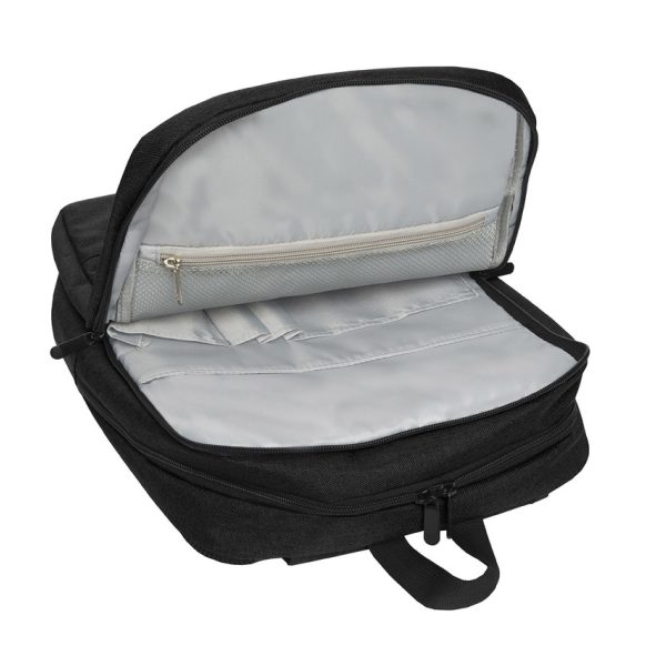 Mochila portanotebook. Amplio bolsillo frontal con cierre lateral. Posee 2 compartimentos acolchados y forrados. El primero con un bolsillo de red con cierre, organizador con pequeños bolsillos, porta bolígrafos y espacio para guardar una tablet. El segundo compartimento contiene bolsillo para notebook de hasta 15″. Correas ajustables y espalda acolchadas con tela de red que permite la ventilación. Tiradores de cierres metálicos.