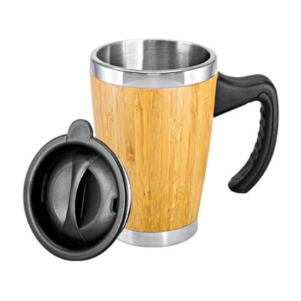 Mug de madera de Bamboo con asa plástica negra, interior de Acero Inoxidable. Tapa plástica negra con dosificador. Presentación en caja de cartón forrado natural.