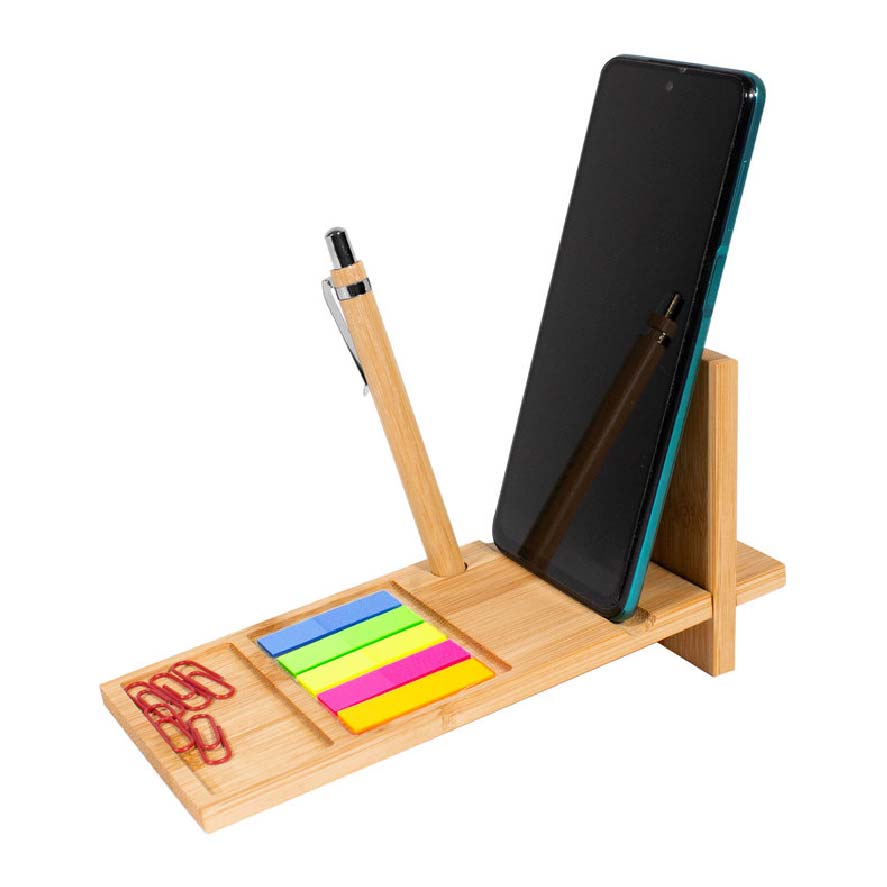 Organizador de escritorio compuesto por dos piezas encastrables con compartimentos para accesorios y ranuras porta boligrafo y porta celular. Parte posterior también funciona como soporte porta celular. Incluye bolígrafo (cuerpo de bambú, pulsador, clip y detalles metálicos, tinta negra), set de 5 señaladores autoadhesivos de diferentes colores y clips en color rojo. Ideal para acompañar tus tareas tanto en la oficina como home office.