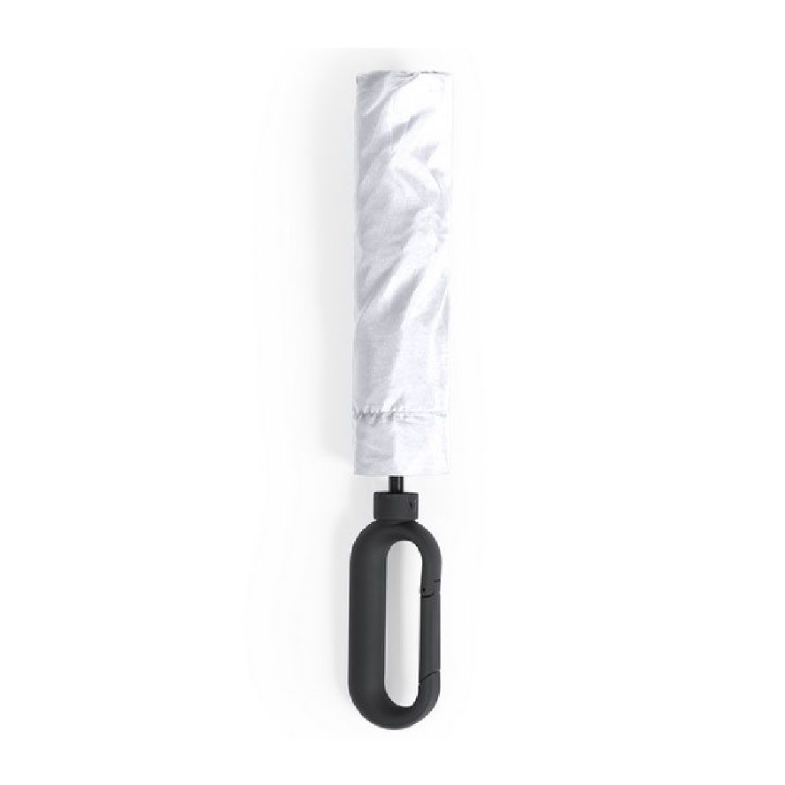 Paraguas plegable de 8 paneles en variada gama de colores. De 100cm de diámetro, apertura manual, con sistema antiviento y en resistente material pongee. Con varillas de fibra en color negro, cierre de velcro y mango ergonómico con mosquetón de enganche integrado.