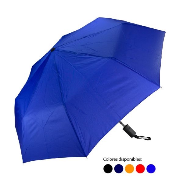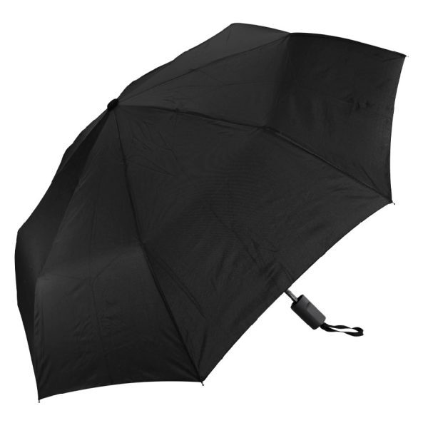 Paraguas corto con 8 cascos. Cuerpo telescópico de 3 secciones y varas reforzadas de Fibra de Vidrio color negro, sistema de apertura manual. Mango recto de EVA negro con cinta negra para colgar. Incluye funda al tono.