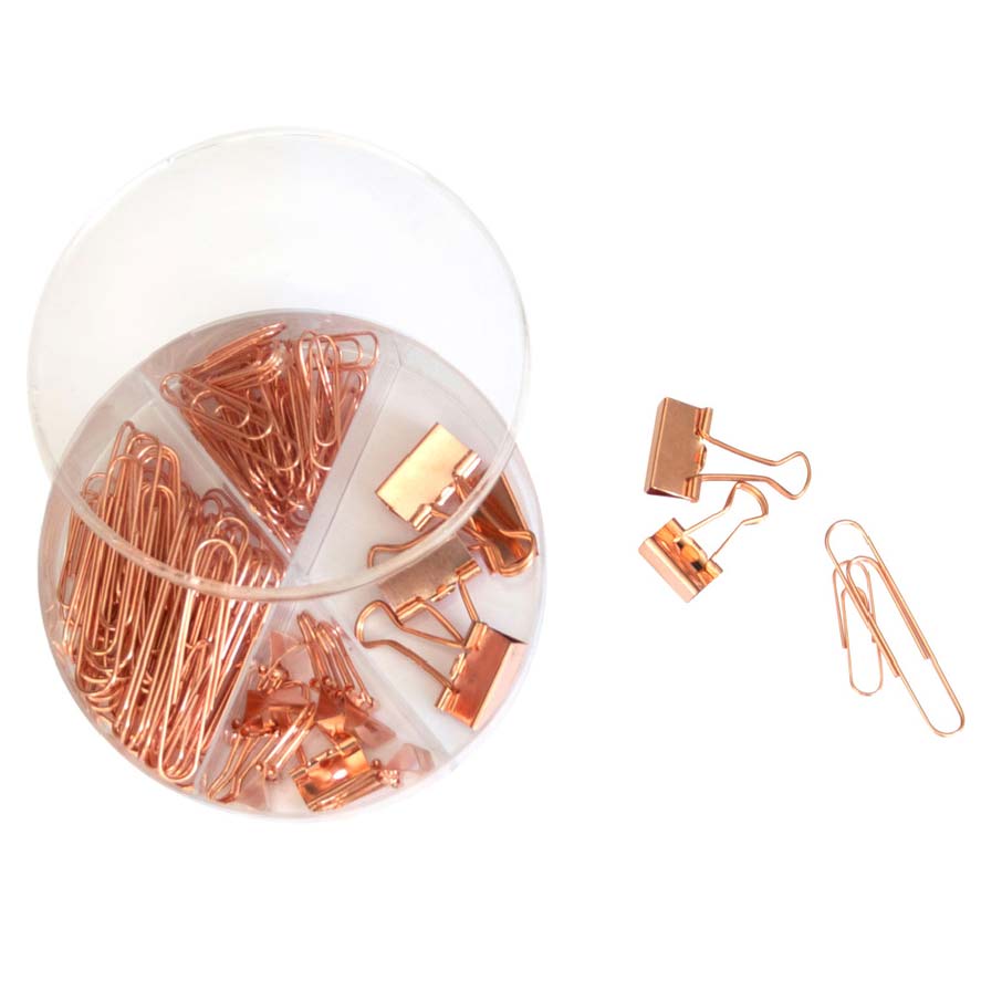 Set de clip y sujeta papeles color cobre en estuche con 4 divisiones. 5 sujeta papeles de 1,9 cm. 8 sujeta papeles 1,5 cm. 30 clip 5 cm. 70 clip 2,8 cm. Estuche contenedor con cuatro divisiones.