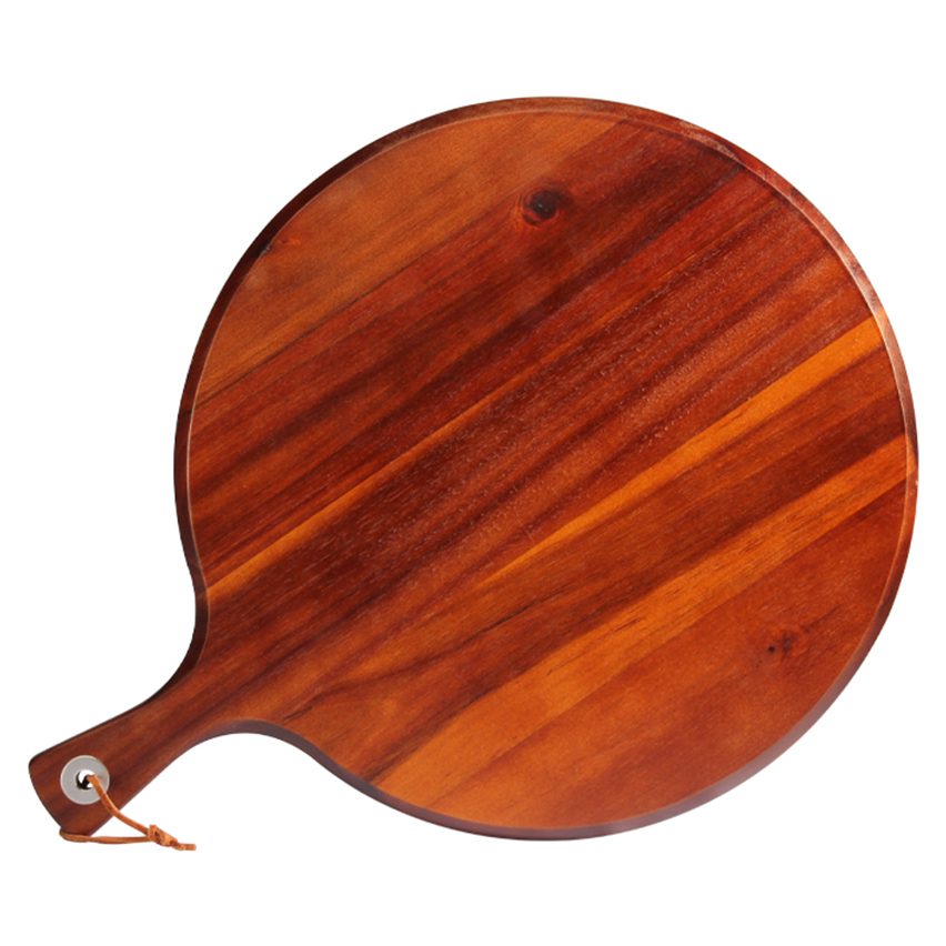 Amplia tabla redonda de madera sólida, con asa, ideal para cortar y servir Pizza. También para verduras y/o selección de quesos. Madera trabajada y acabada en máquina, de forma 100% regular, con superficies y cantos lisos y suaves, para una mayor higiene y comodidad al momento de cortar y servir alimentos. La Acacia, junto con la Teca, es considerada la mejor, más dura y más resistente madera para utilizar para cortes de alimentos – Densidad aprox. 770kg/m3. – Dureza 9.5 (test de Monnin)
